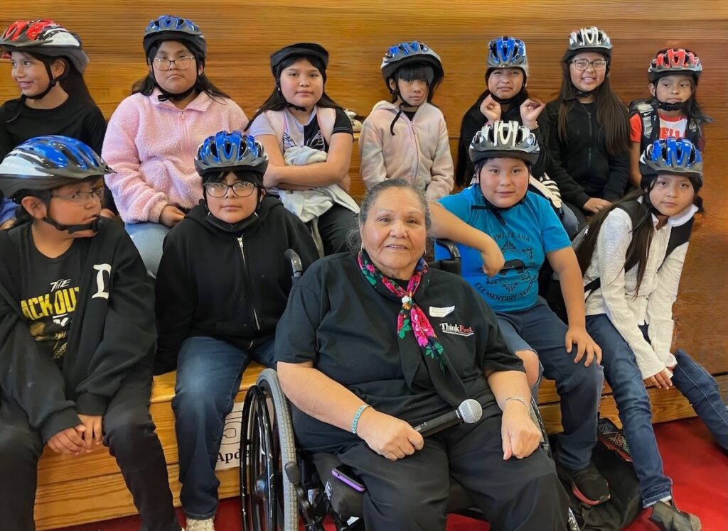 Cecelia Fred with students wearing new sports helmets at Zuni (Shiwi Tsana) Elementary School in Zuni, NM. Helmets provided by the NM Governor’s Commission on Disability.