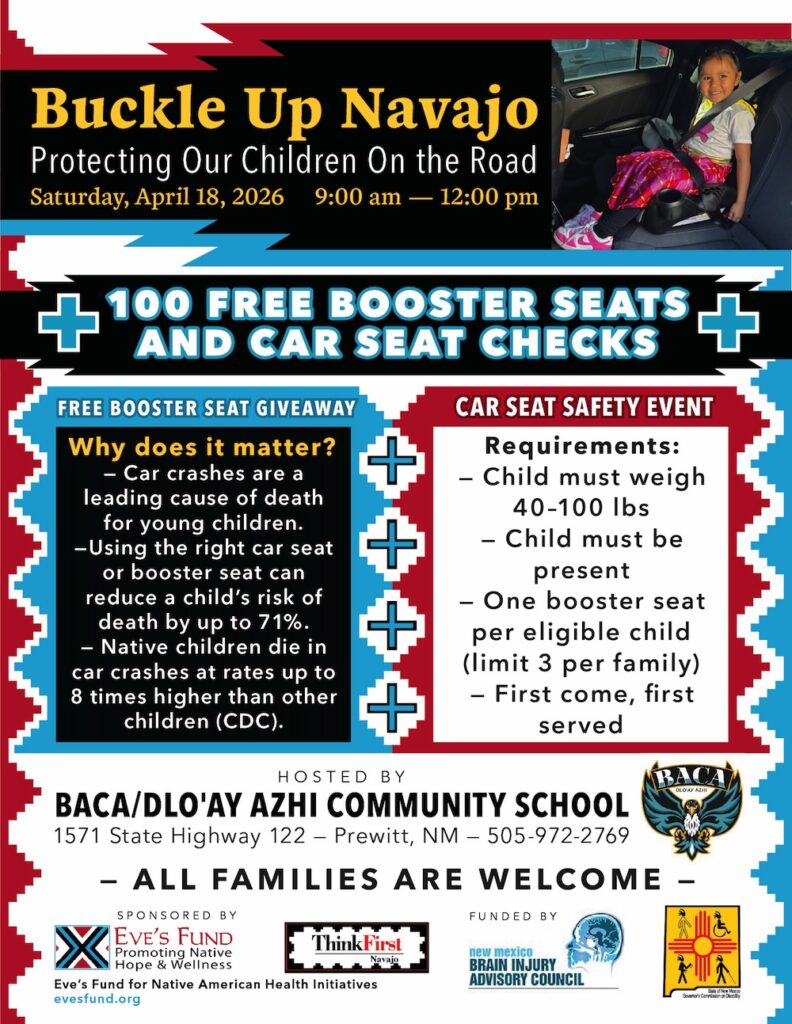 Eve’s Fund is sponsoring a free booster seat giveaway in Prewitt, New Mexico through the Buckle Up Navajo community safety event, providing 100 free booster seats to eligible children. This event focuses on protecting children on the road by offering booster seats, safety education, and access to certified car seat technicians.